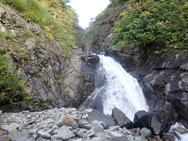 3連瀑の手前に5m、10m+3mCS滝が続く。5mは容易だが続く10m+3mCSは登るのが難しいと思う。右岸ルンゼから巻きに入るが土砂が堆積していて危なめ。途中上流には3連瀑の最初であるえげつない直瀑が見えてしまう。引き続き巻くと小滝を挟んで2つ目も登れるか微妙で巻いていたら、3つ目とその上部にある小滝もダメっぽい。一気に巻いていくが幾つもルンゼを跨ぐのでライン取りが重要となる。この連瀑地帯の解明はそれだけで一日仕事となり、一泊二日での遡行に盛り込むには難がある。1500mから1934m独標を経て池へ向かう沢にも小滝や10mクラスの滝が幾つも現れる。直登できない場合は極端に悪い草付きを登らされる。「ウミタニ、秋の草付き祭り!」