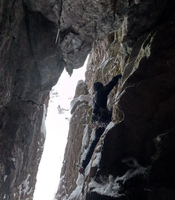 P3正面壁は登山大系に記載されているものの、行ってみると概念がよく理解できない。どの壁に行ってもそうなので、筆者の空間把握能力が乏しいのだと思う。幾何は得意ではないし、道路は全然覚えられない。それでも何とか登山が楽しめるのは地図とコンパスがあるから。実に有難いことである。閑話休題。浅い凹角に雨後特有の薄いベルグラがびっしり張っていて面白そうなのでそこから取り付いた。草付きはズルズルだし、ベルグラが張っていてホールドは埋まっている。錫杖では珍しいスラブで、当日のコンディションも相まってとても面白いラインであった。コンディションによっては氷が張るのでスクリューも準備しよう。弱点を探して草付きを少し登り左へ入ると、どでかい凹角に合流する。凹角に入ると岩が脆くて中々危ない。フェース面や浅いクラックから支点が取れないのでコーナーへ逃げざるを得ない。コーナーも岩そのものが脆いので、支点を取る際にはテスティングを怠らぬように。ビレイポイントが落石フォールラインに被るので特段の注意が必要だ。落石の影響も考慮して大洞穴で一旦ビレイしたほうがいい。そこから大チムニーを上がり少し右へトラバースすると安定した灌木でビレイできる。ここでタイムアップ。そこから先はスラブ状フェースに右上するコーナークラックが続いており、ここからカンテを回り込むように見える。しかし、カンテの向こうにラインがつながっているか判別できなかった。